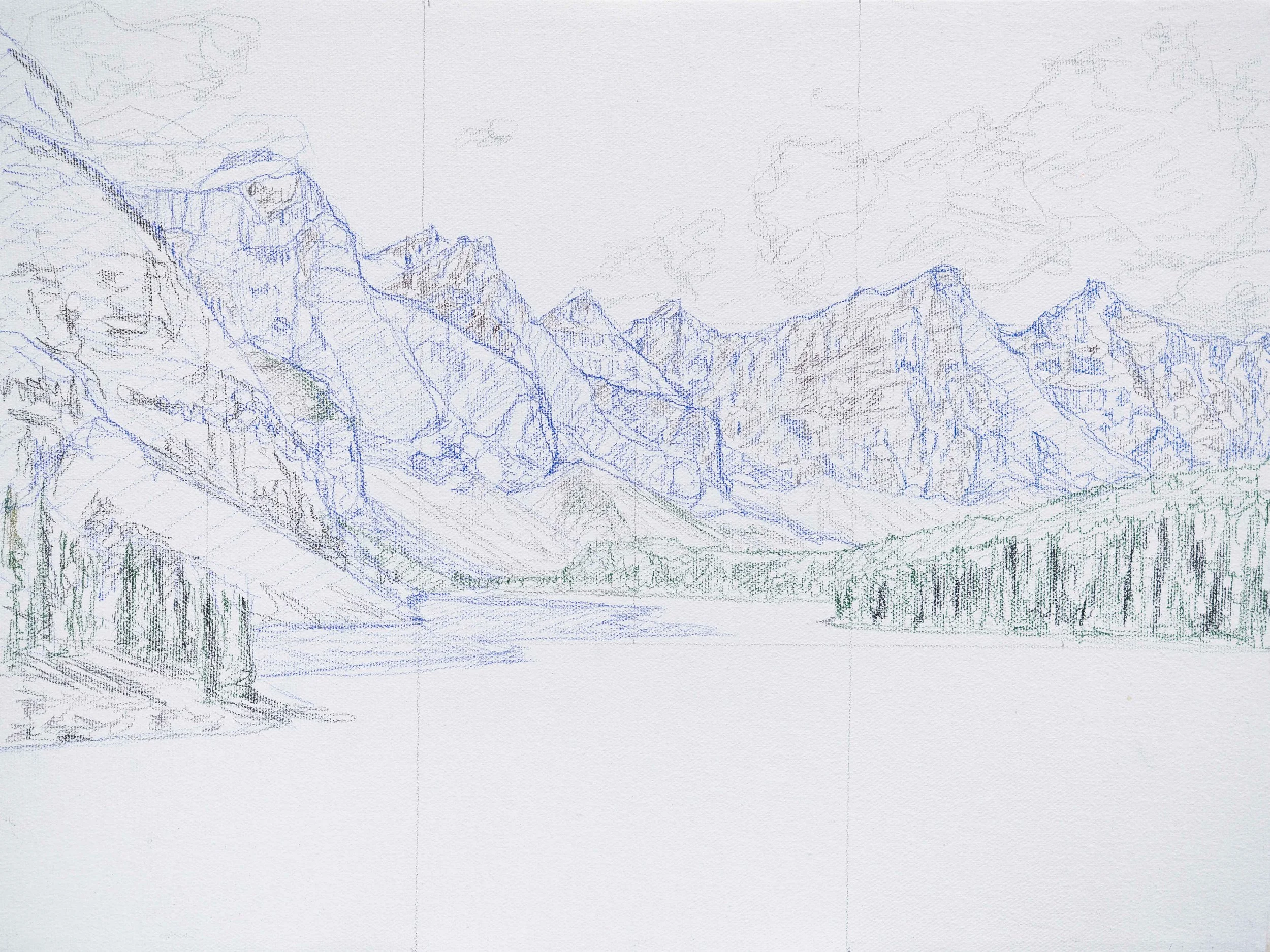 For our sketch, start with your rule of thirds grid, continue with loose simplified outlines, and finish by detailing the sketch with your color pencils (representing the different elements in the composition with different colors; e.g. trees with green pencil, rocks with brown and black pencil, snow with blue and grey pencils, etc.).