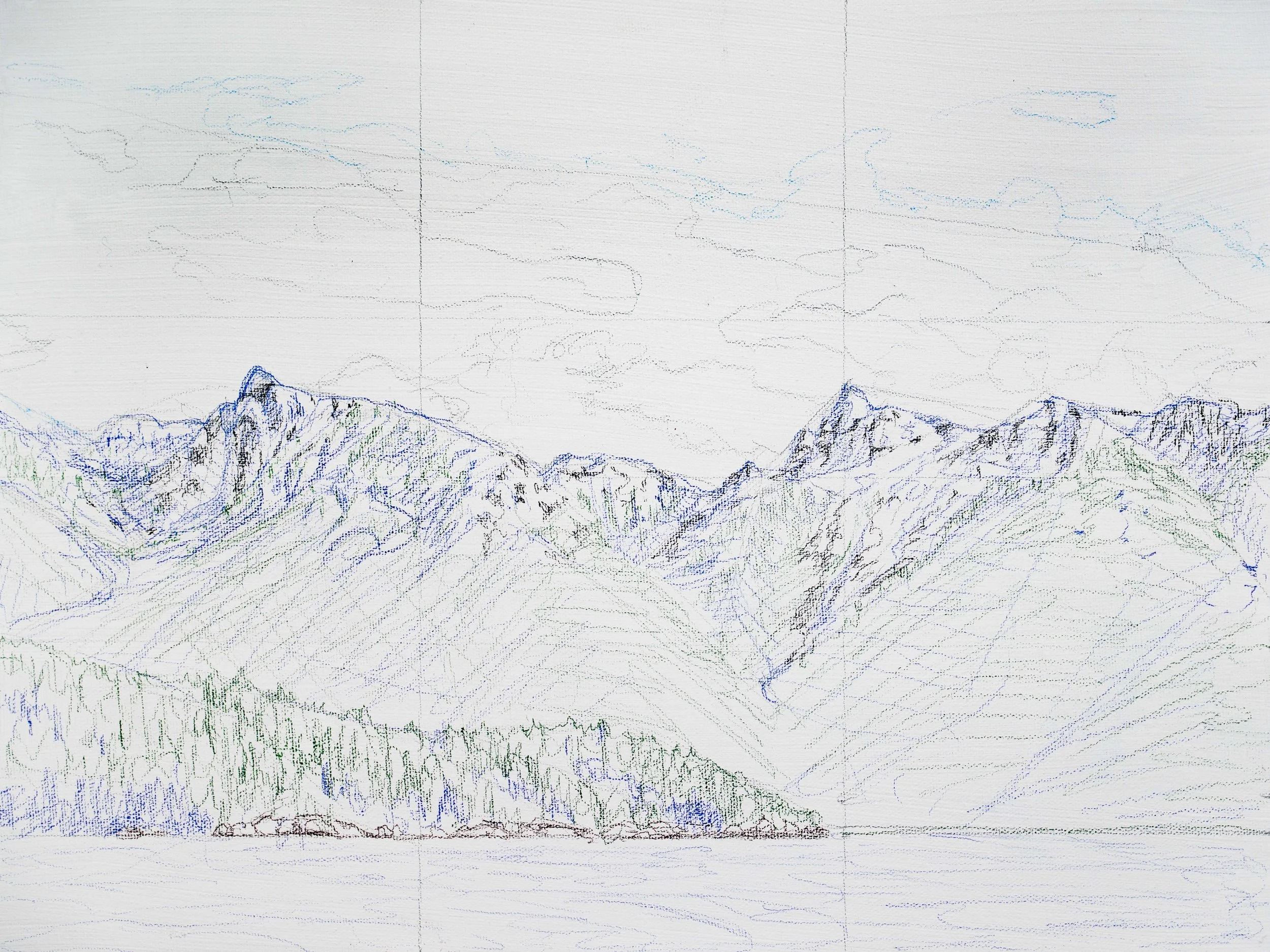 As I mention during class, our sketch is meant to be loose and more of a guide for our painting, rather than a beautifully finished drawing. We will be painting over it anyways! We want to focus on getting the right perspective and general shapes of our landscape features right and leave the fine detail for our painting process.