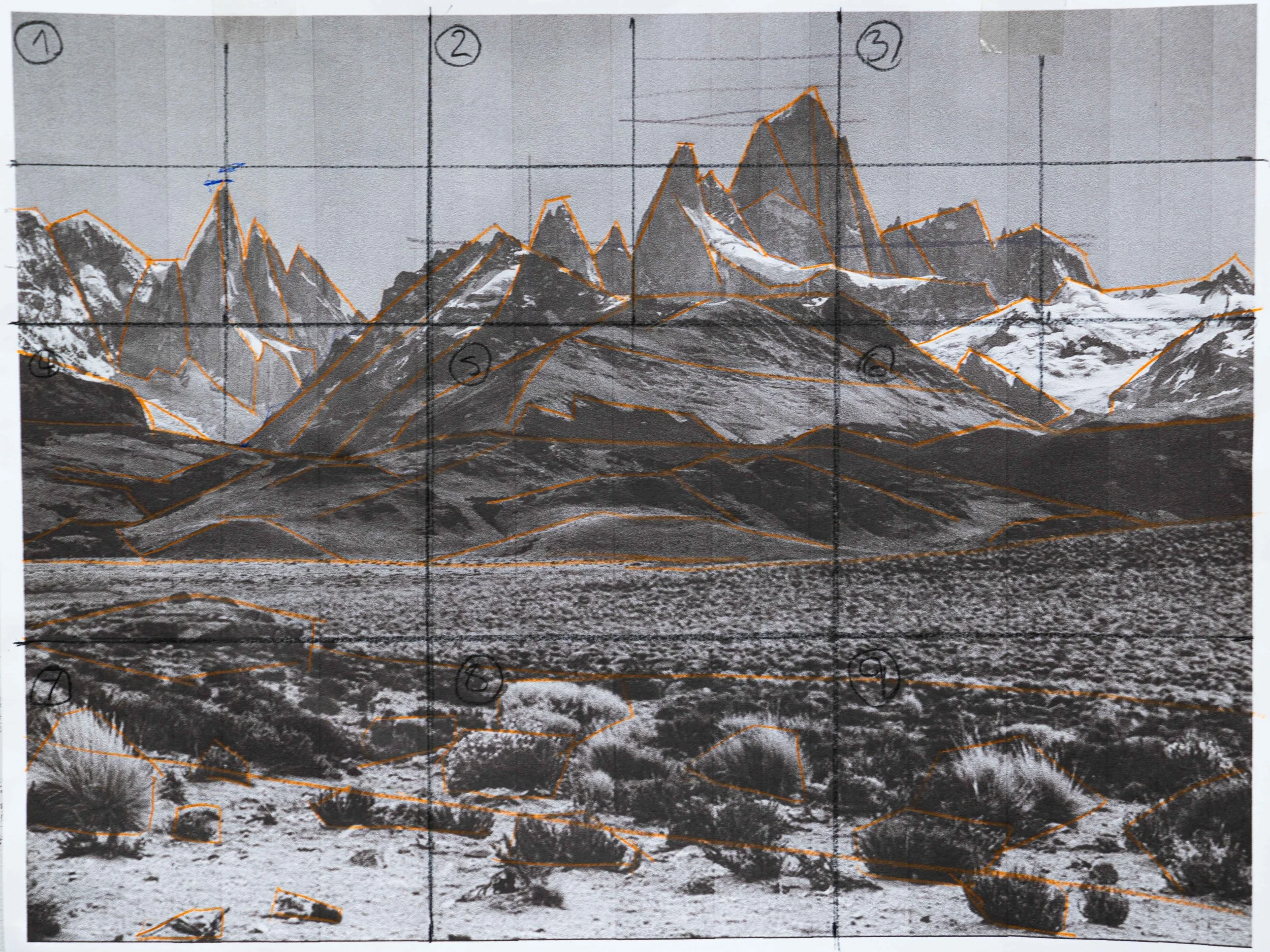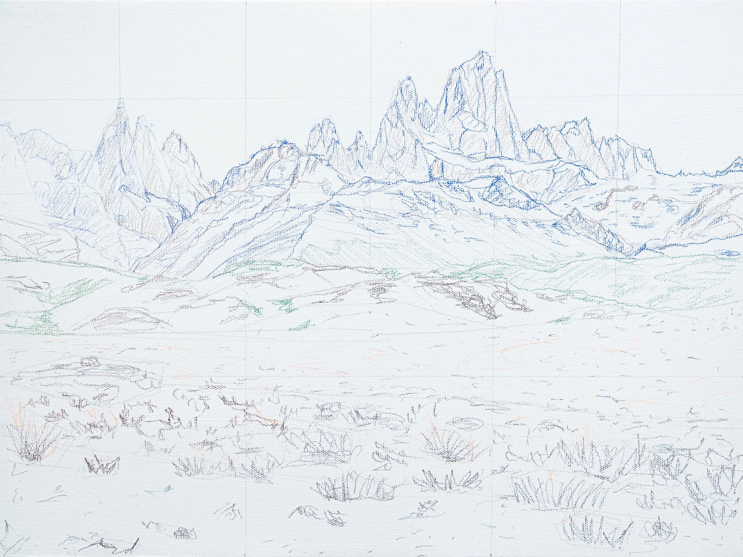 As I mention during class, our sketch is meant to be loose and more of a guide for our painting, rather than a beautifully finished drawing. We will be painting over it anyways! We want to focus on getting the right perspective and general shapes of our landscape features right and leave the fine detail for our painting process.